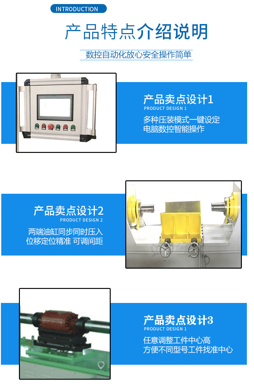 主要用于電機(jī)轉(zhuǎn)子兩端軸承壓入,兩端油缸同步同時(shí)壓入 位移定位精準(zhǔn)